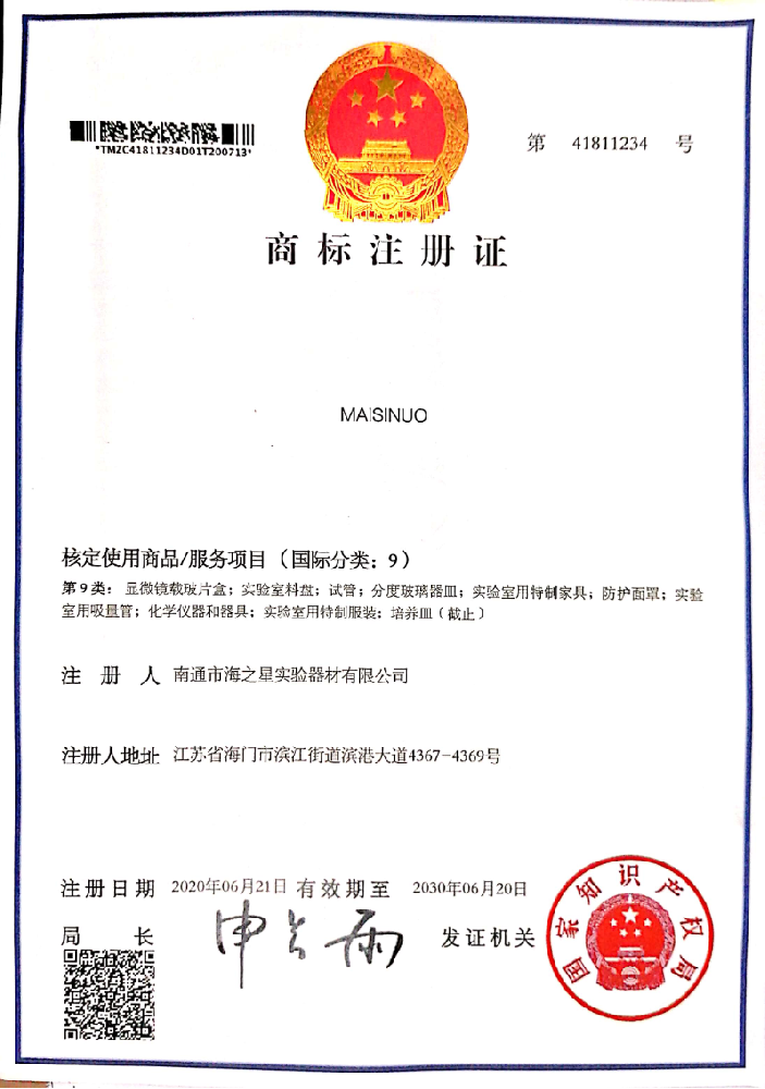 公司因發(fā)展需要,注冊麥斯諾英文商標——“Maisinuo”實驗室,