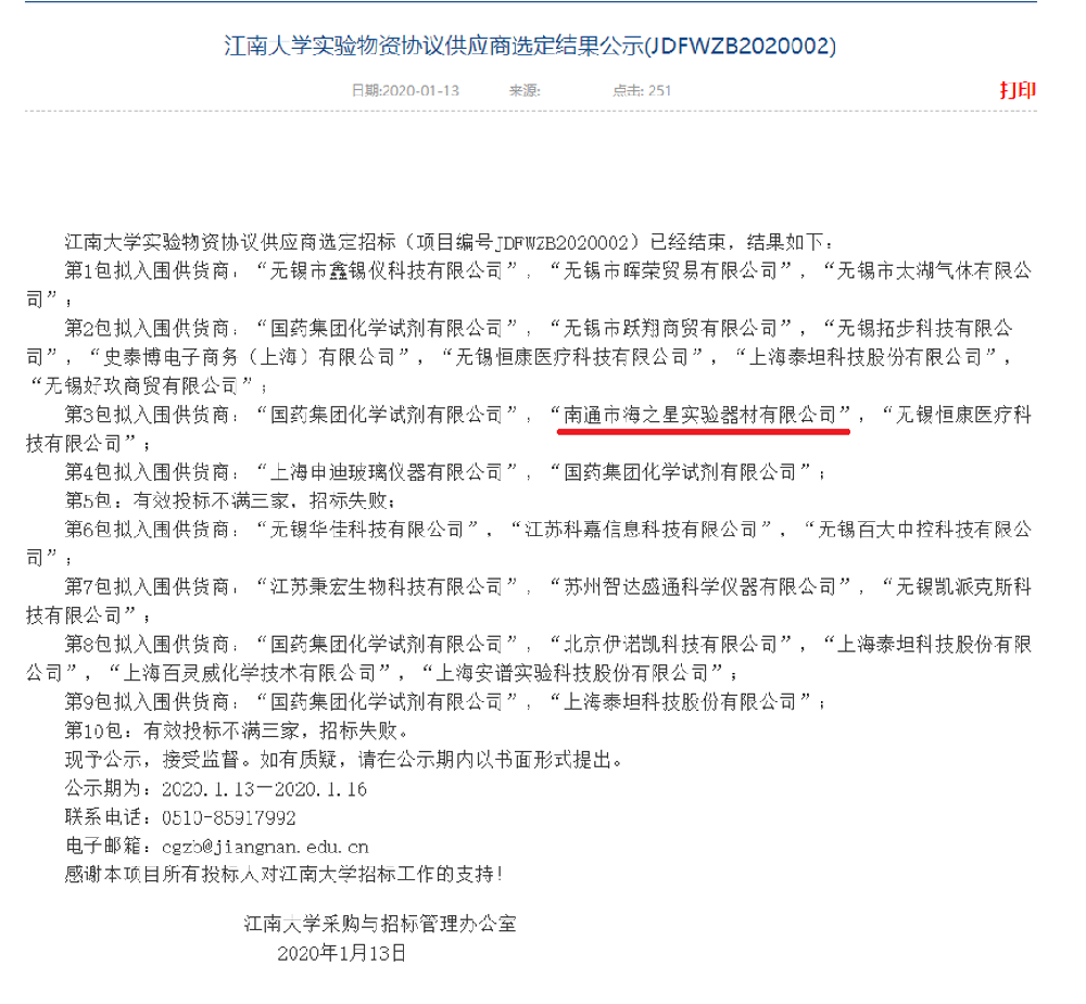 江南大學實驗物資協(xié)議供應(yīng)商選定結(jié)果公示(JDFWZB2020002)